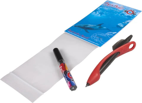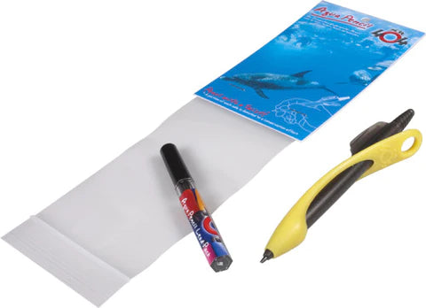 The Aqua Pencil is great for the average diver, dive instructor, technical diver, researcher, boater, or anyone in or near the water who wants to take notes. Carry the Aqua Pencil on every dive and always be prepared to track navigation, sketch aquatic life for later identification, note deco stops, dive site names, or just play tic-tac-toe while you are hanging. For boaters, combine the Aqua Pencil with Wet Notes to track sail trim, navigation, weather conditions, boat conditions. Birders can keep memos in even the wettest conditions.
