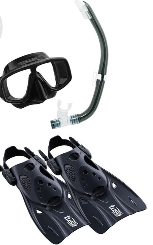 The Platina Hyperdry Adult Travel Set includes a UM-20 Mask, USP-160 Snorkel, and UF0103 Fins. The UM-20 Mask is designed for maximum field of view, and features a high quality polycarbonate frame, EZ adjust buckle technology, and a ClearVu tempered glass lens. The USP-140 Snorkel features TUSA Hyperdry technology that reduces the chance of water flow into the snorkel. The snorkel also includes a drain chamber and purge valve for easy clearing, and a silicone mouthpiece. The UF0103 Fins are exclusively designed for travel with a short blade design, soft comfortable open-heel foot pocket, and adjustable silicone strap. The open-heel is designed for ease of entry and a secure fit. This sturdy fin is engineered to provide a lot of power for its small size. The set comes standard with a travel bag.