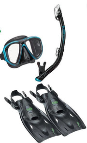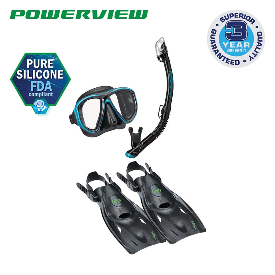 The Powerview dry travel set includes a high-quality 2-window mask with enhanced vision, EZ adjust buckle technology, ClearVu tempered glass lens and pure silicone skirt and strap. The dry snorkel features TUSA Hyperdry Elite dry top technology (pat p) that stops water from entering into the snorkel, a drain chamber and purge valve for easy clearing and silicone mouthpiece. The fins have an advanced multi-flex long blade design, thrust channel technology for superior propulsion and the foot pocket is made with a soft, durable compound designed for comfort. The open-heel design allows for quick and easy size adjustment and the silicone heel strap enhances comfort and durability. This fin is engineered to provide a lot of power for its compact size. The fins are lightweight and ideal for travel. Comes standard with travel bag.