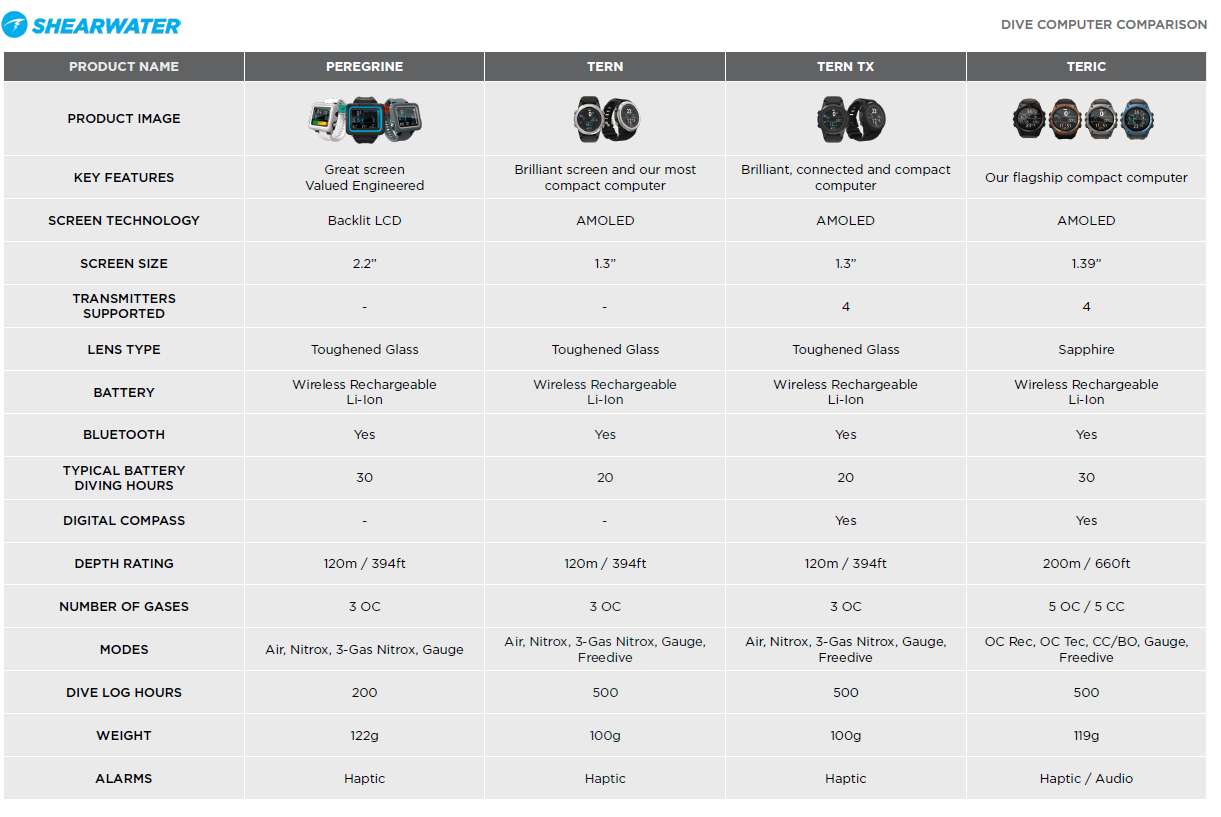 “Building upon the success of the Peregrine and borrowing features from the Teric, the Tern and Tern TX make a great addition to our product line. The Tern is an affordable option for anyone seeking a compact sport diving computer.” Said Jason Leggatt, CEO of Shearwater Research Inc. “As well, we are excited to bring transmitter-enabled computers to more divers, delivering precision gas pressure information on a brilliant display. The Tern TX is an incredible sport diving computer to those seeking a comfortable, round form. In combination with the Swift Transmitter, the Tern TX offers a world-class transmitter-enabled system at an attractive price”.